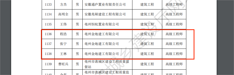 2023年12月11日,安徽省住房和城乡建设厅公示了“2023年度安徽省建设工程专业高级工程师专业技术资格评审”通过人员名单。亳州金地建工有限公司共计3名同事顺利通过高级工程师职称评审。