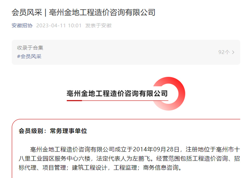 近日,亳州金地工程造价咨询有限公司被安徽省招标采购协会吸收为常务理事单位。